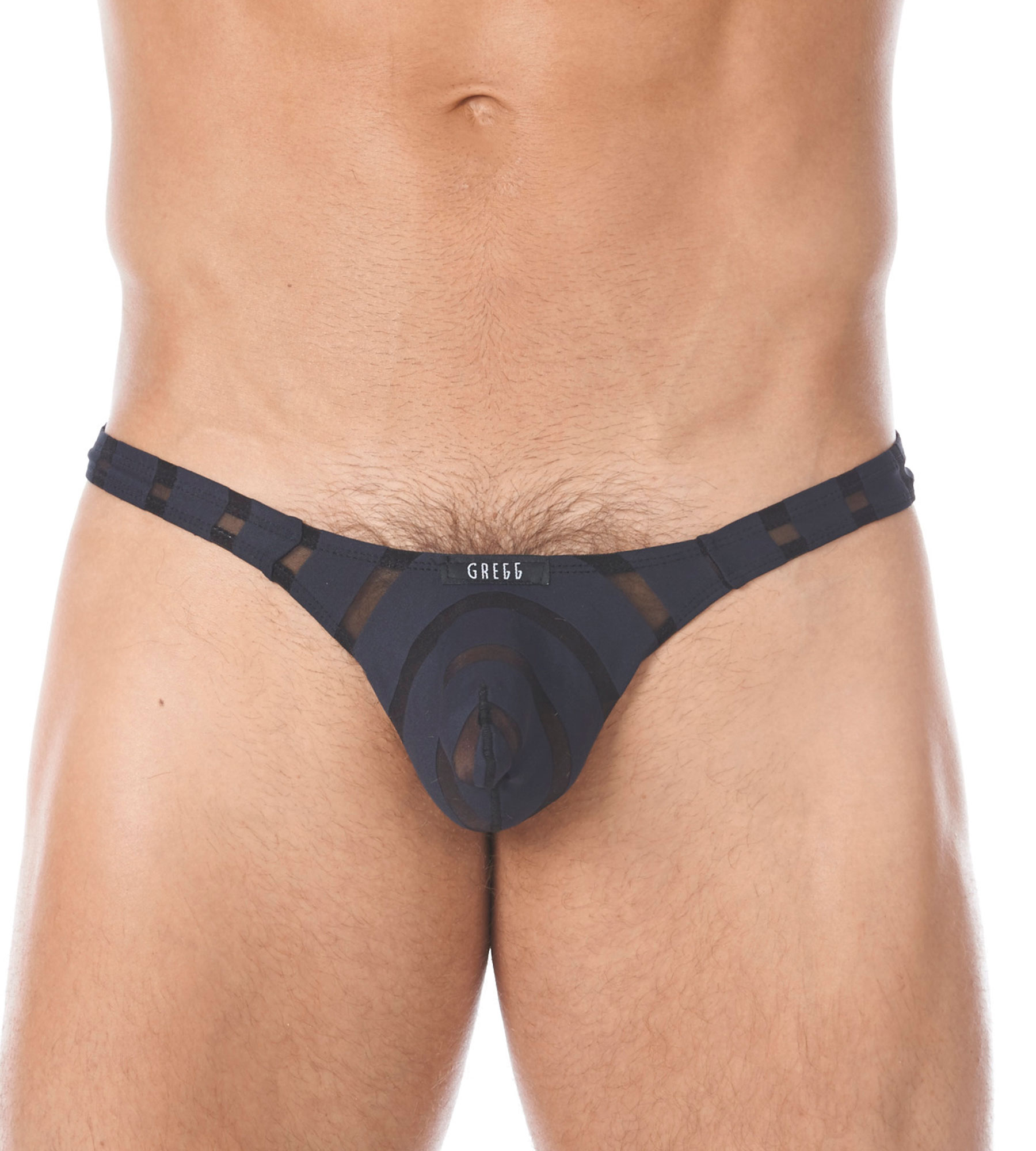 Hier sehen Sie den Mini String, aus der Serie Encore, von Gregg Homme. Dieser schwarze String wird von transparenten Streifen durchbrochen, was teilweise den "Inhalt" zeigt. Durch den Einsatz von Micro Polyamid ist der string sehr weich auf der Haut und angenehm zu tragen. Der beutel passt sich Ihrer Form an.