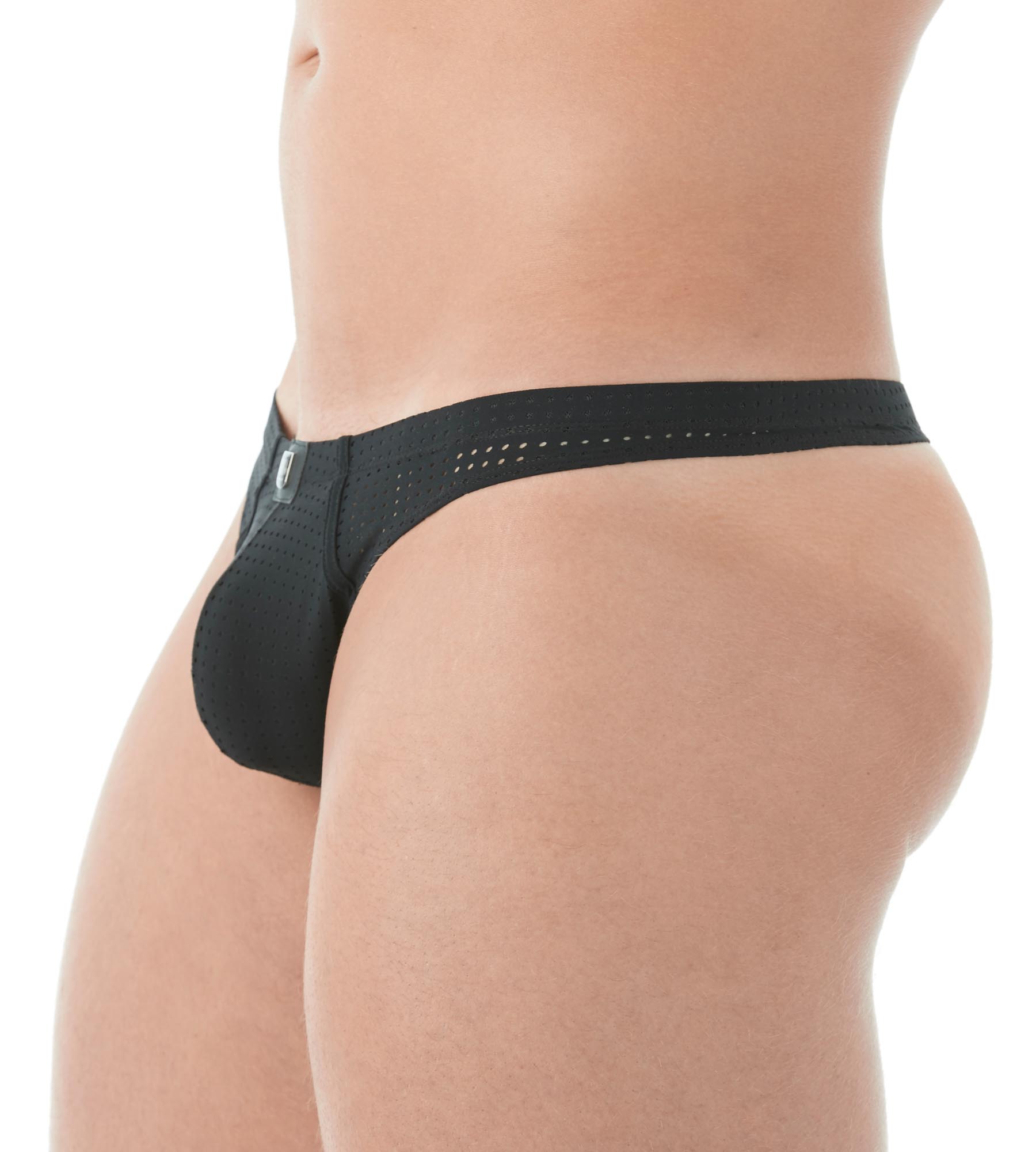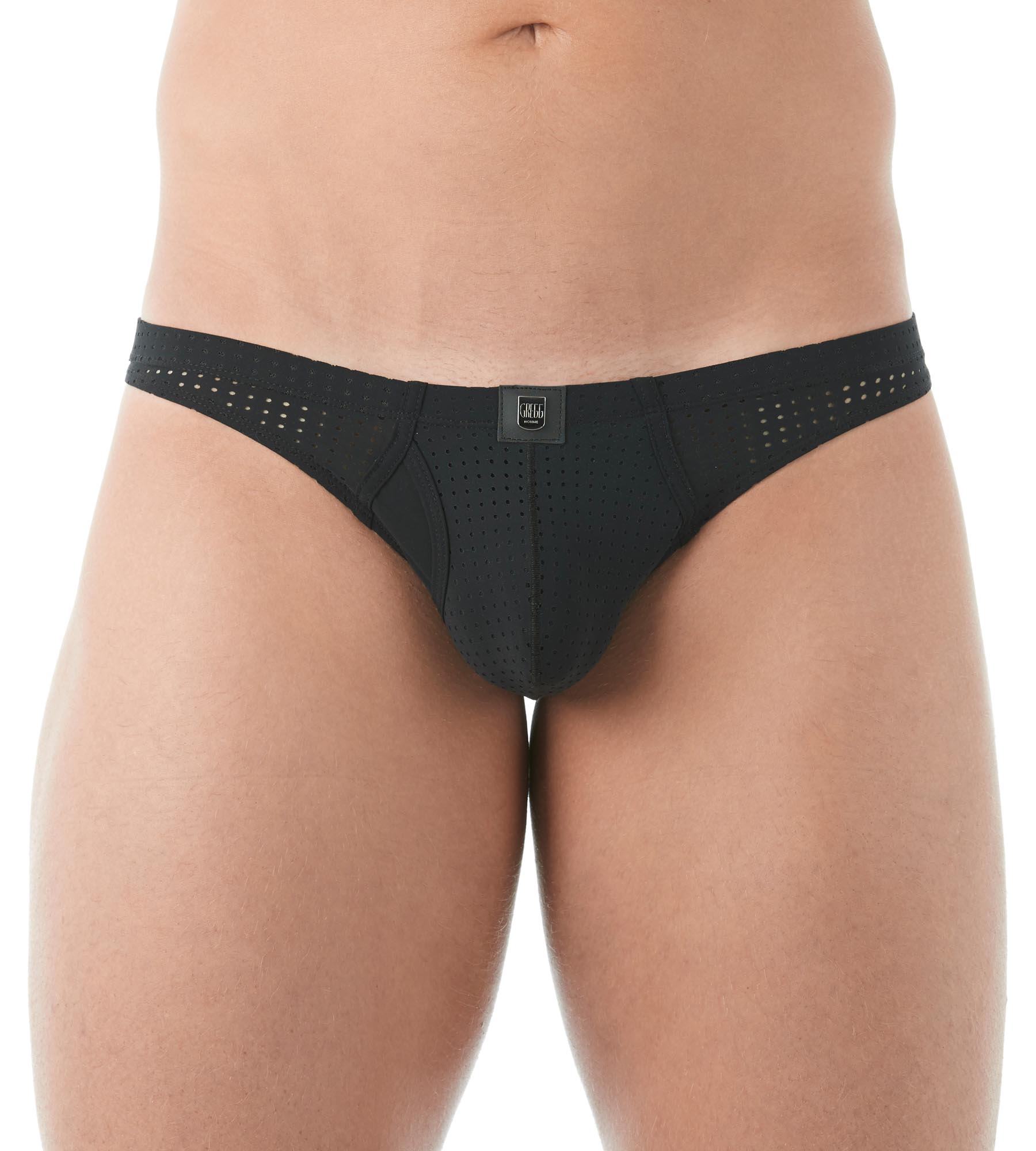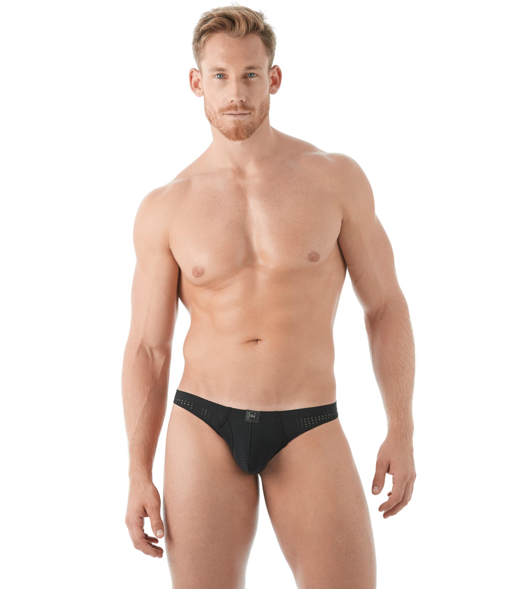 Hier sehen Sie den String in schwarz, aus der neuen Serie Drive, von Gregg Homme. Hergestellt ist der String aus einem feinen perforierten Stoff, weshalb Dieser sehr atmungsaktiv. Der String passt sich der Form an, ist sportlich, modisch geschnitten. Weich auf der Haut und angenehm zu tragen.