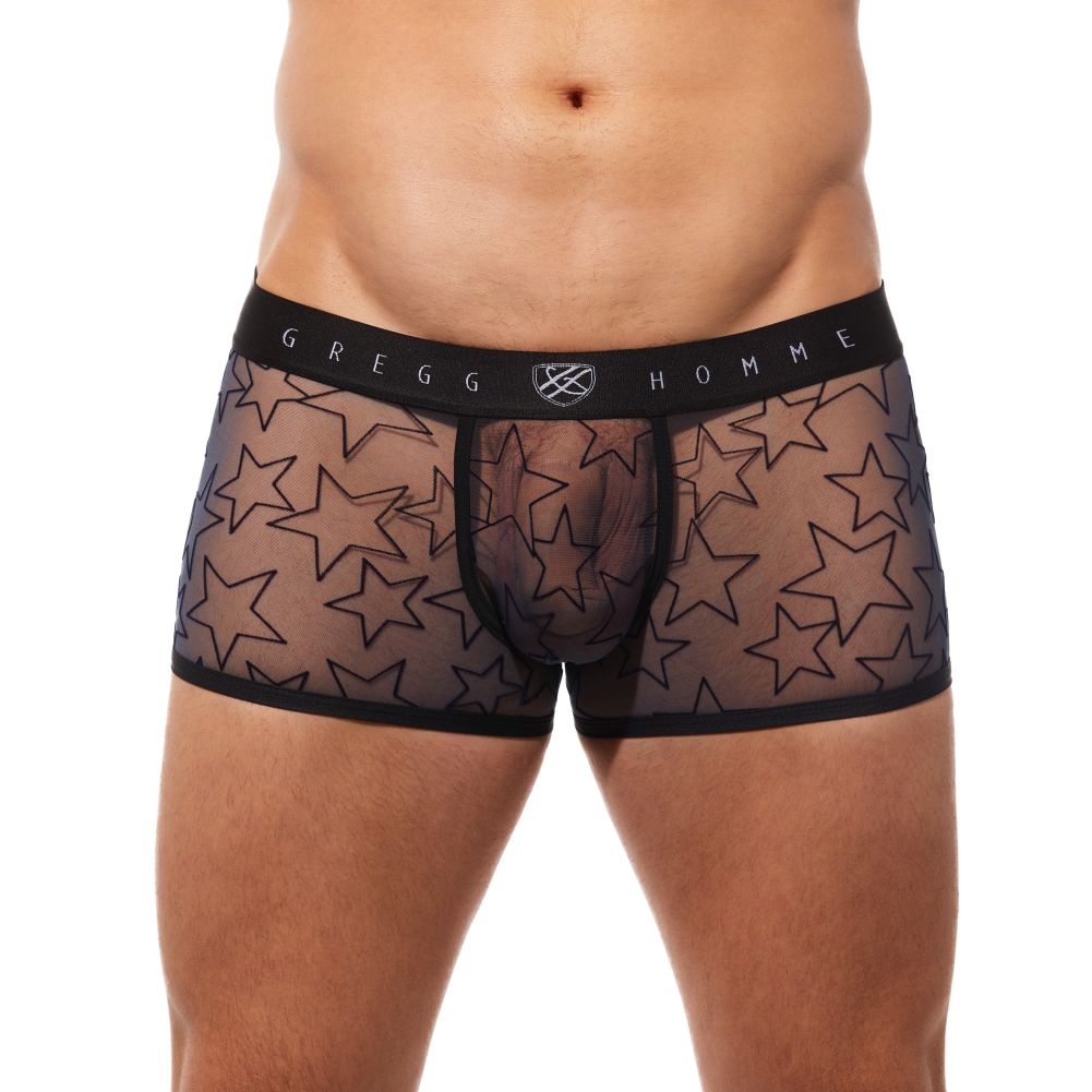 Hier sehen Sie den Boxer Pant, aus der Serie Starr, von Gregg Homme. Dieser ist sehr transparent, zeigt mehr als er verhüllen sollte. Der Mesh-Netzstoff zeigt Ihre Vorzüge, mit einem einzigartigen beflockten Sternenmuster. Weich auf der Haut und angenehm zu tragen.